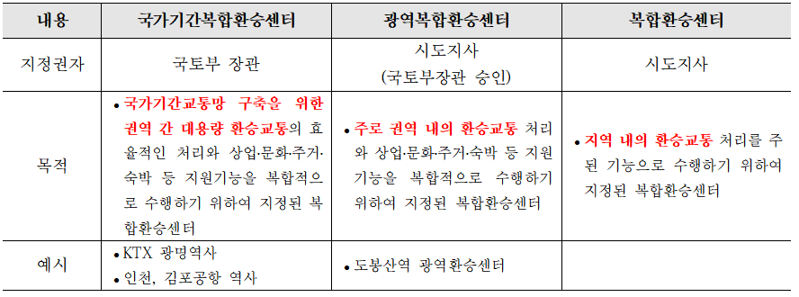 여러 교통수단이 연계되는 결절점에서 환승편의를 위한 연계 교통시설과 문화, 상업기능을 갖춘 사회경제적 활동을 복합적으로 지원하기 위한 시설 『국가교통체계효율화법』 제2조15