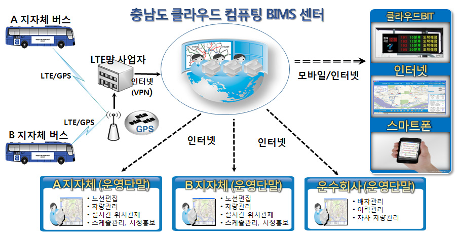 - 클라우드 방식에 기초한 버스교통정보체계(시스템)는 지자체별로 단일 버스교통정보센